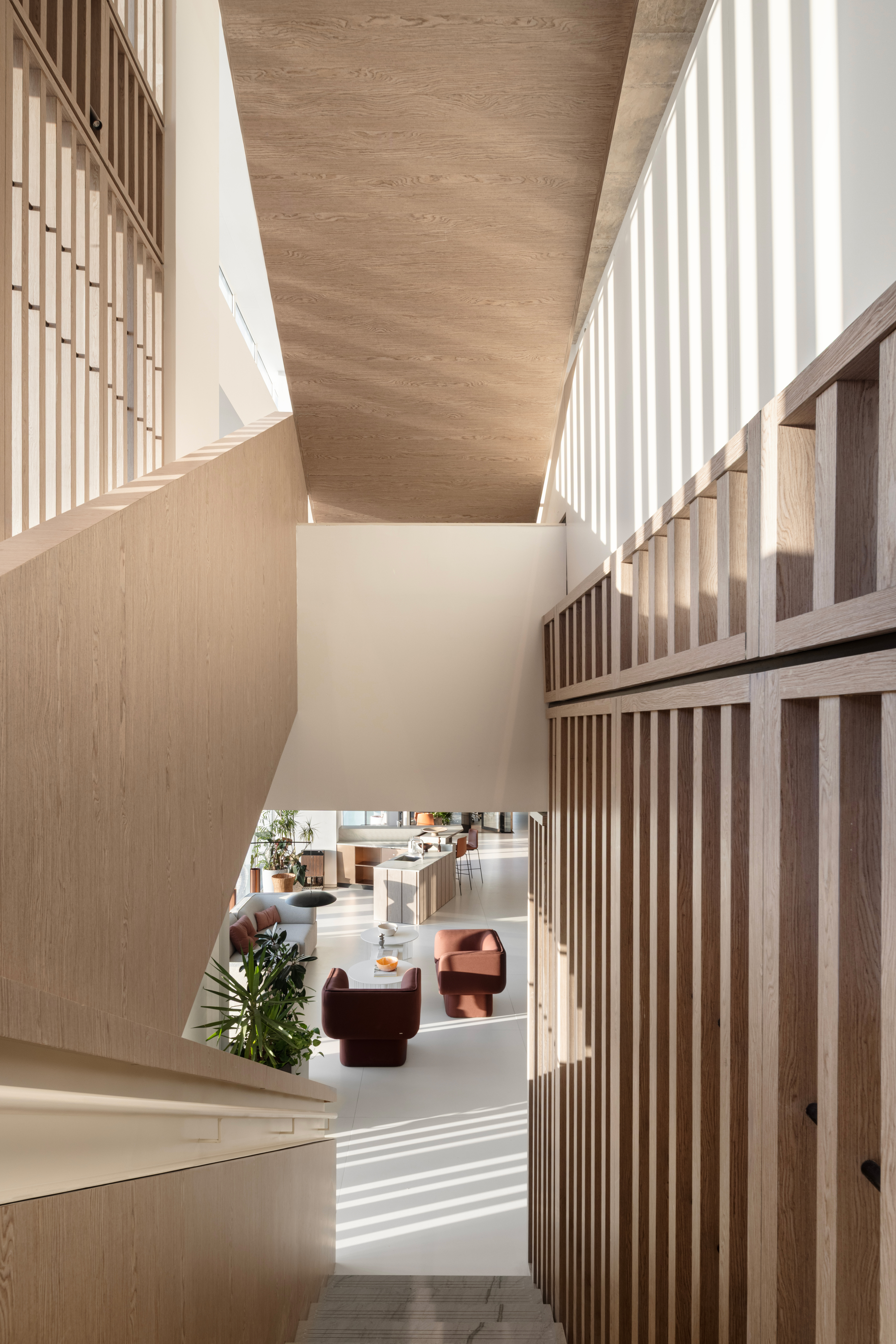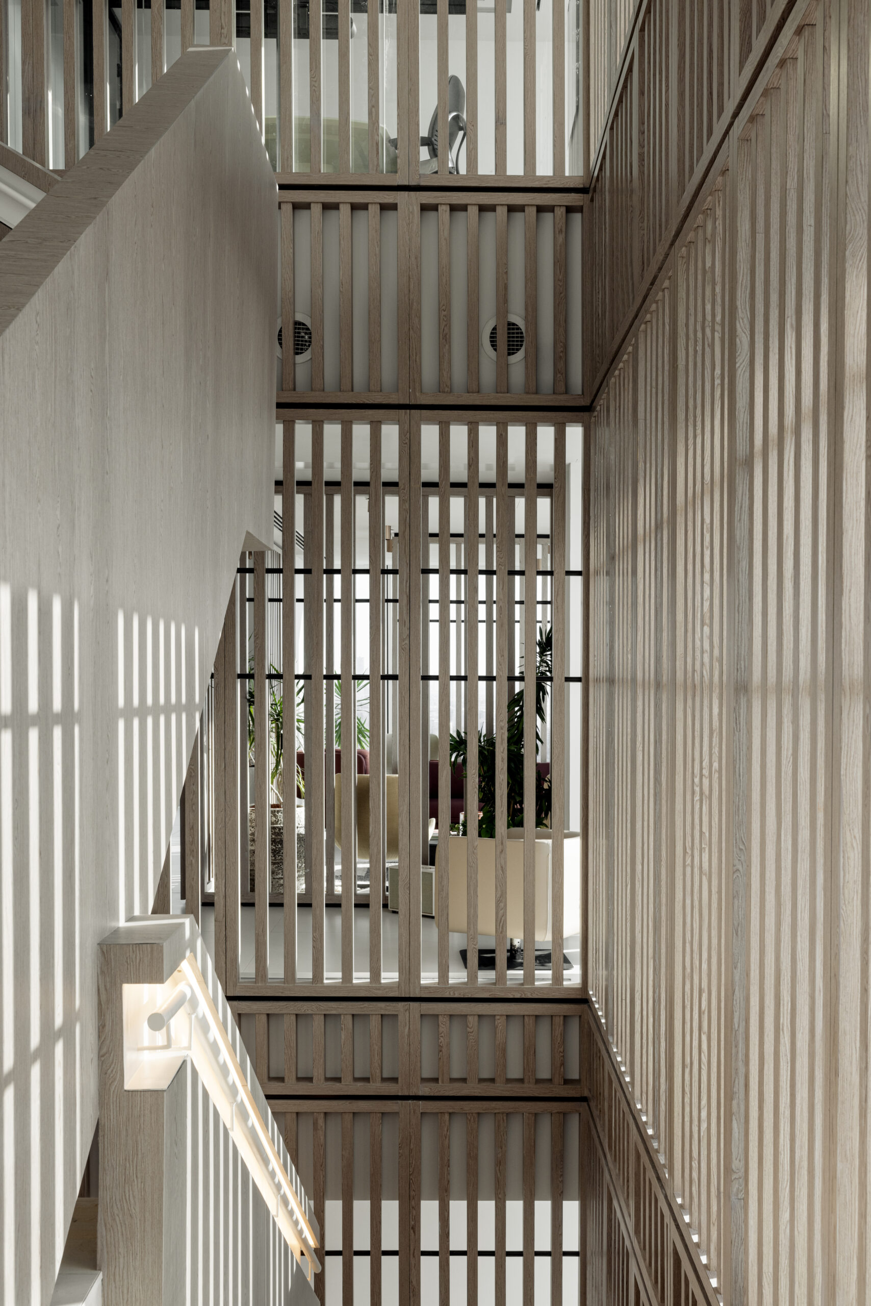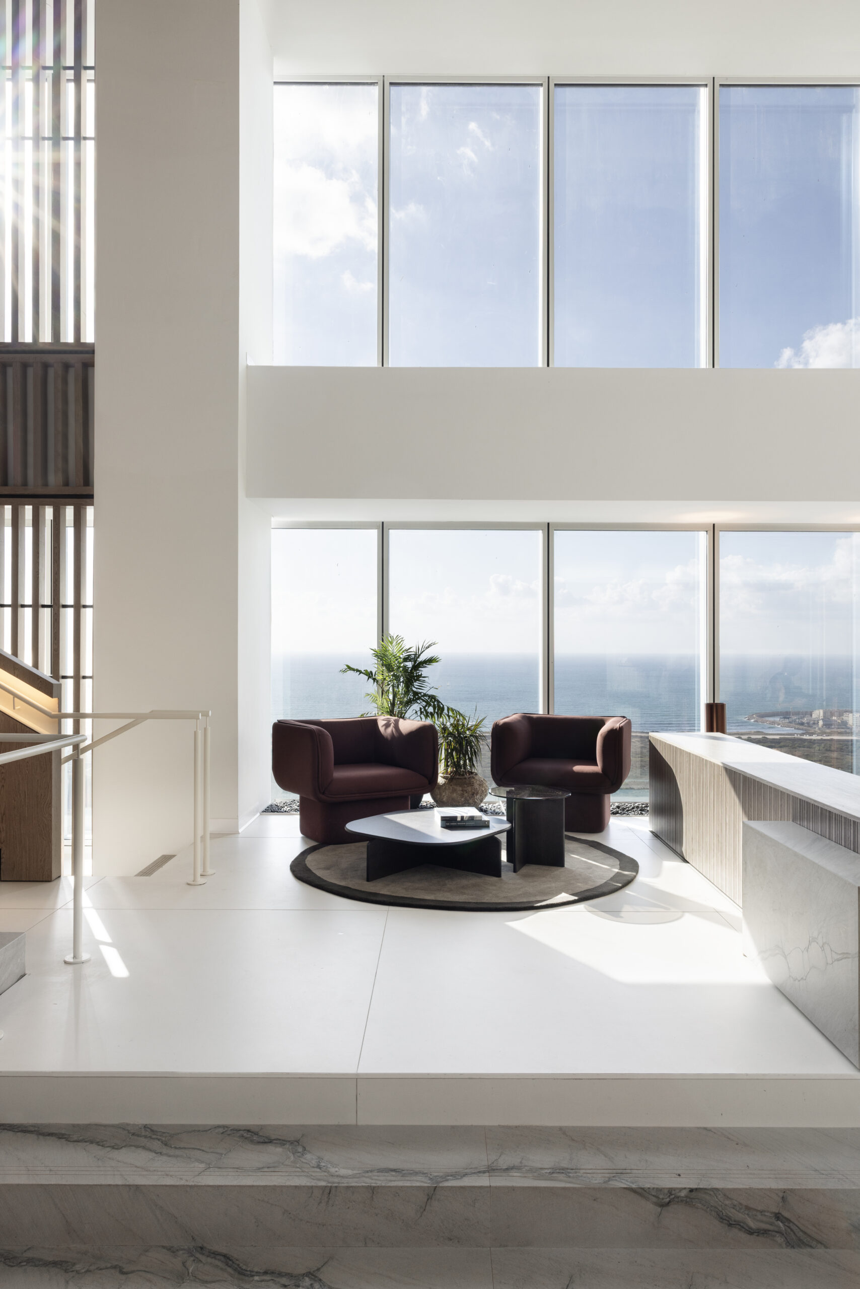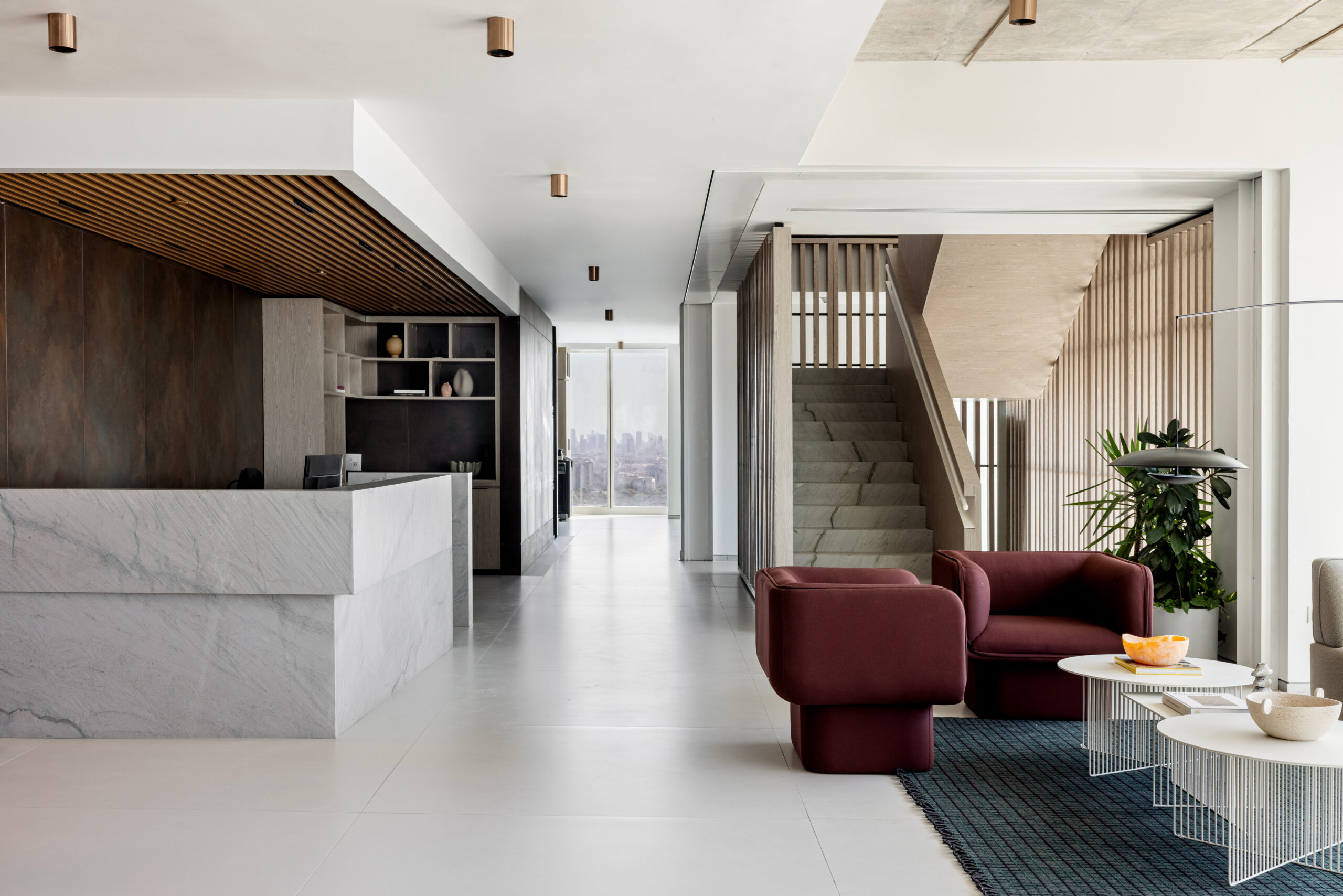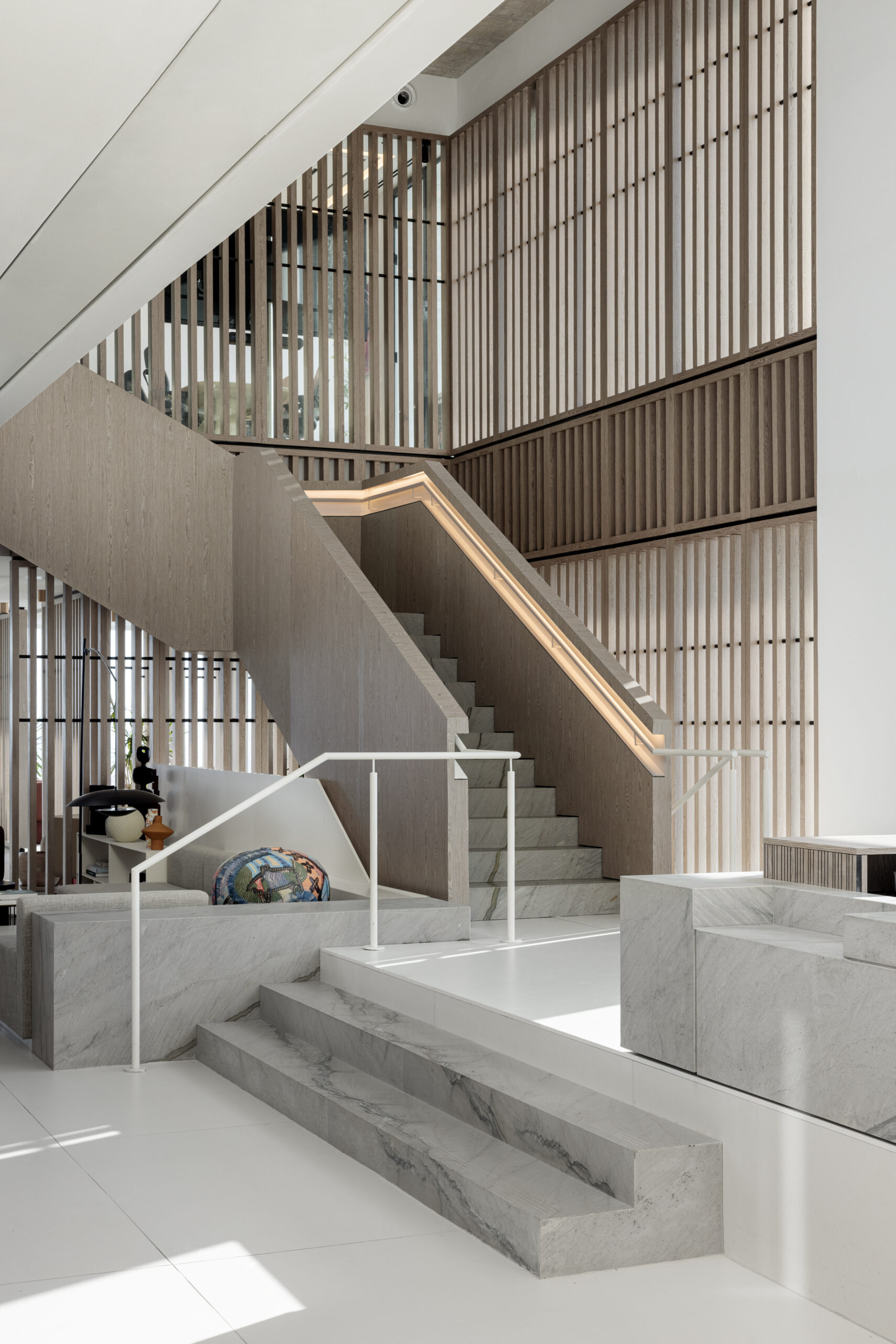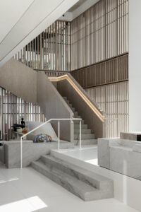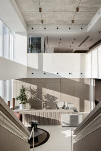 גרם מדרגות מרשים המחבר בין הקומות — אלמנט אדריכלי בולט שתוכנן כחלק אינטגרלי מהשפה העיצובית של המשרד.