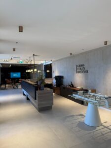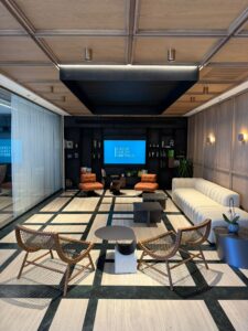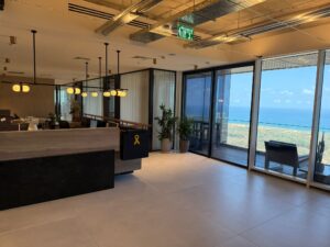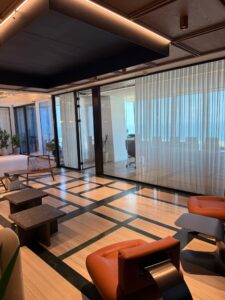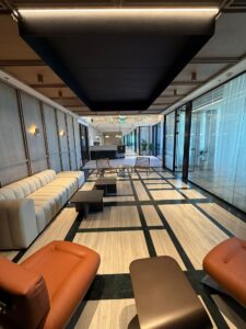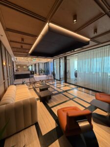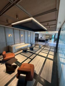 אזור לאונג’ כניסה מרשים הכולל רצפת שיש ותקרה מנוגרת