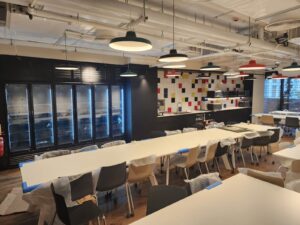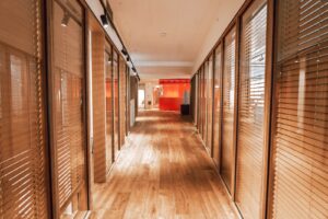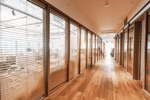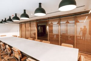 חלל הפנים עוצב בקווים נקיים ובחומרים יוצאי דופן — מחיצות הפנים עשויות מקירות מסך שקופים עם צלונים נשלטים בתוכם, המחדדים את תחושת המרחב והאור.
